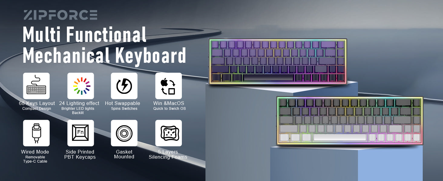 ZIPFORCE 68-Key Mechanical Keyboard, Blue Liner Switches, Type-C Wired Connection, Multi-Color Mixed Backlight, PBT Keycaps, 100 Million Keystroke Lifespan, Hot Swappable Compact Gaming Keyboard